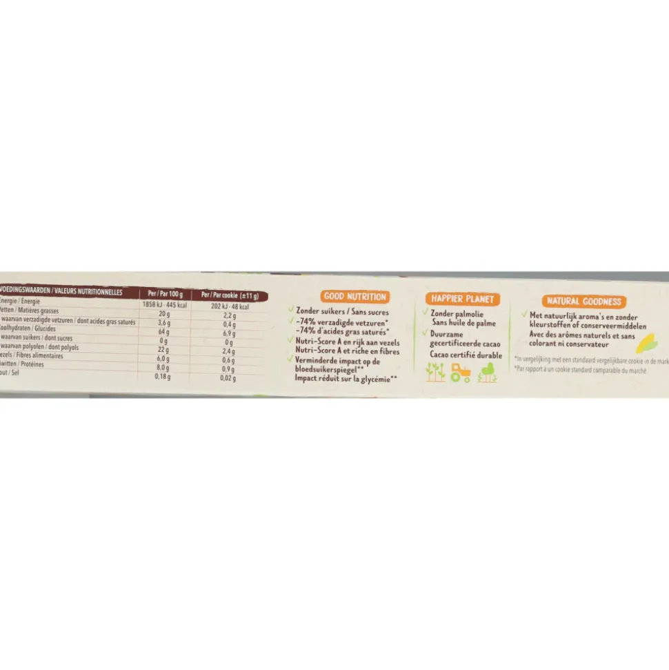 Tarwebloem 53,2%, zoetstof: maltitolen, stukjes chocolade met zoetstof 13,3% (cacaomassa^1, zoetstof: maltitolen, cacaoboter^1, emulgator: lecithinen), koolzaadolie, geroosterde hazelnoten 5%, tarwevezels, emulgator: lecithinen, natuurlijke aroma’s, rijsmiddelen: citroenzuur, natrium- en ammoniumcarbonaten, zeezout.