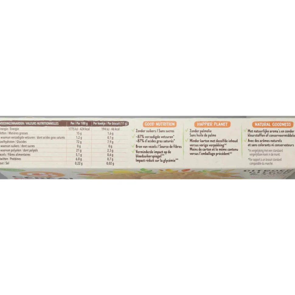 Per 100 g Per zakje (44 g)Energie 1775 kJ / 424 kcal 781 kJ / 187 kcalVetten 15 g 6,6 gwaarvan verzadigde vetzuren 1,2 g 0,5 gKoolhydraten 72 g 32 gwaarvan suikers 0 g 0 gwaarvan polyolen 21 g 9,2 gVezels 5,1 g 2,2 gEiwitten 6,0 g 2,6 gZout 0,22 g 0,10 g