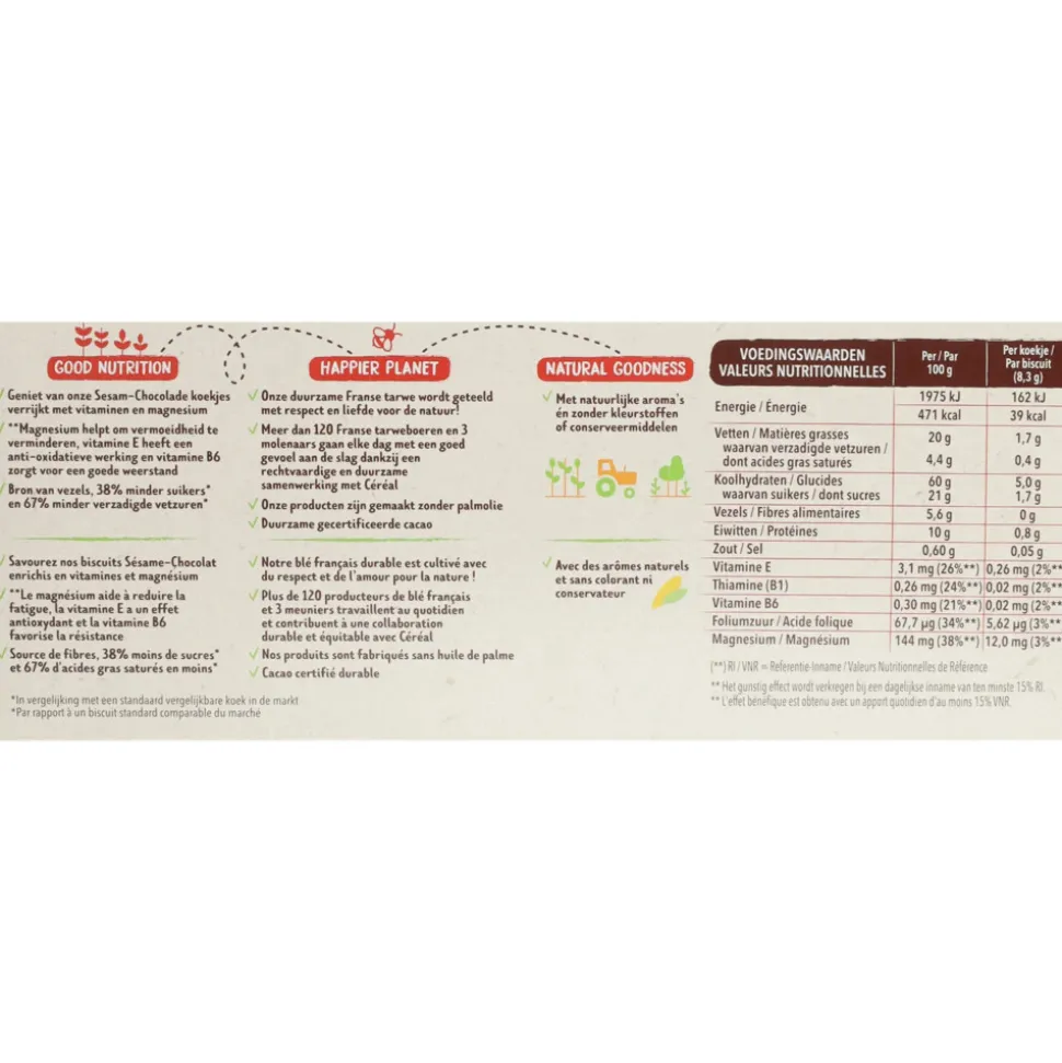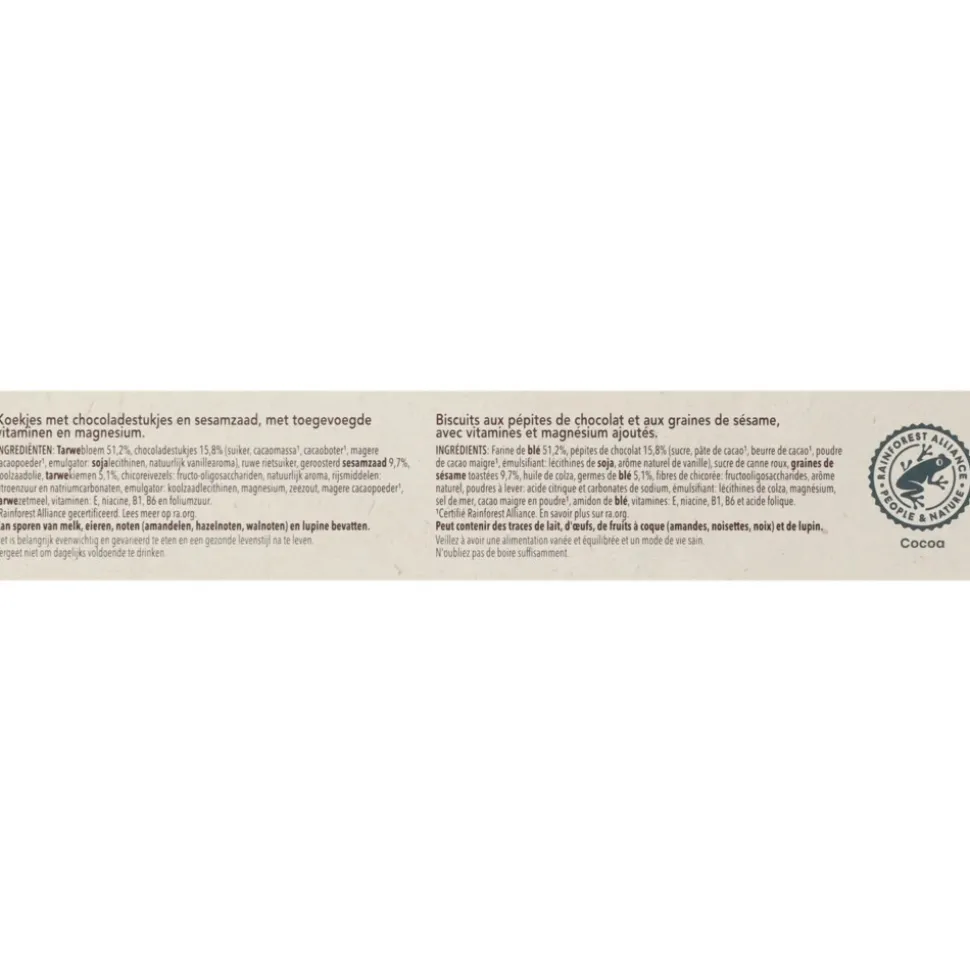 Céréal Koekjes Sesam Chocolade zijn koekjes met chocoladestukjes en sesamzaad, met toegevoegde vitaminen en magnesium.