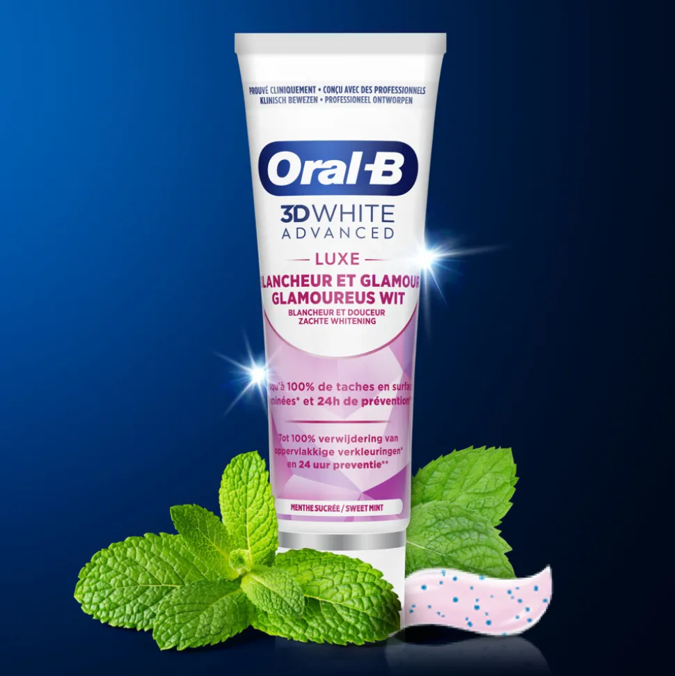 Oral-B 3DWhite Advanced Luxe tandpasta heeft de geavanceerde whitening-technologie van Oral-B. Het diep doordringende schuim verwijdert oppervlakkige verkleuringen actief van moeilijk bereikbare plaatsen en de voedende fluoride versterkt het glazuur. Met twee keer per dag poetsen beschermt het ook gedurende het hele etmaal actief tegen oppervlakkige verkleuringen.