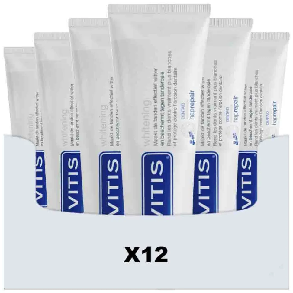 Vitis maakt gebruik van een nieuwe Haprepair Technologie om tanden en kiezen natuurlijk wit te maken. Vitis Whitening herstelt de natuurlijke witte, frisse kleur van tanden snel en doeltreffend. Bevat geen peroxiden of schurende bestanddelen en is daarom ideaal voor dagelijks gebruik. De tandpasta bevat daarbij ook werkzame stoffen die aanslag en verkleuringen van o.a. roken, koffie, thee en kleurstoffen uit ons eten verwijderen. Tanden en kiezen krijgen hun natuurlijke witheid en glans weer terug.