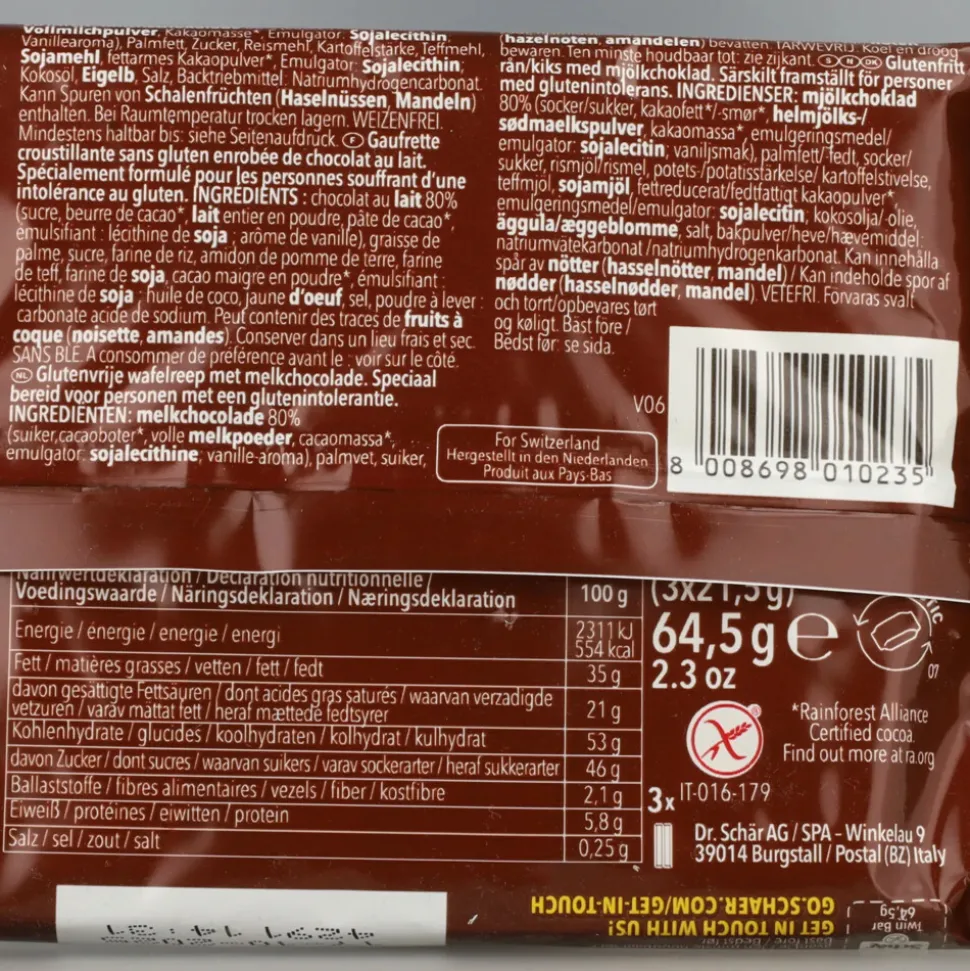 Schar Twin Bar is een heerlijke glutenvrije wafelreep met zacht-romige melkchocolade die op verrukkelijke wijze wegsmelt op uw tong. De krokante, brosse wafel vormt samen met het zoete chocolade jasje een onweerstaanbaar tussendoortje. Schar Twin Bar is gemaakt van uitsluitend glutenvrije en tarwevrije grondstoffen.