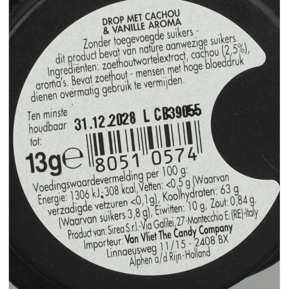 Drop, cachou (2,5%), smaakstoffen, zoethout.