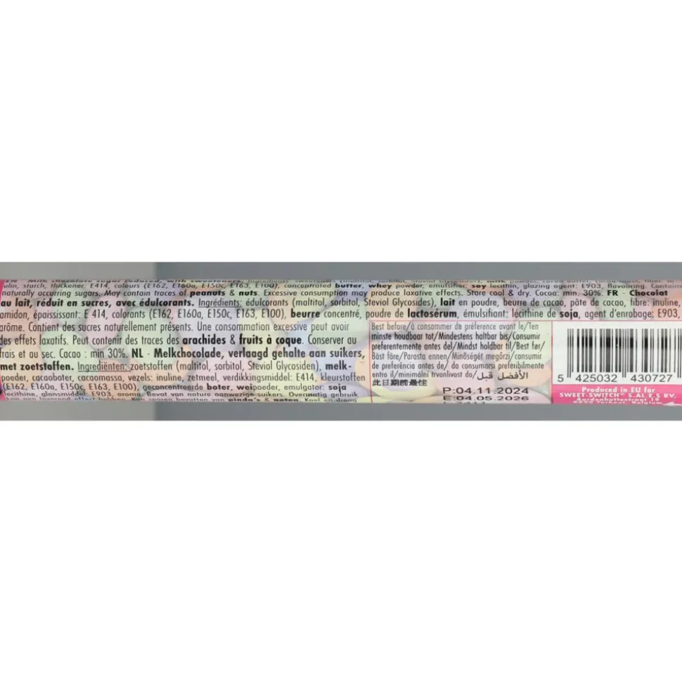 Zoetstoffen: (maltitol, sorbitol, steviolglycosiden), melkpoeder, cacaoboter, cacaomassa, vezel: inuline, verdikkingsmiddel: E414, kleuren (E171, E162, E160a, E150c, E163, E100), boterconcentraat, weipoeder, emulgator : sojalecithine, glansmiddel: E903, aroma. Cacaobestanddelen: min 30%.