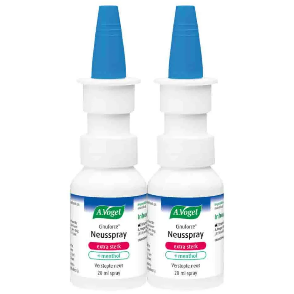Medisch hulpmiddel Cinuforce Neusspray Extra Sterk bevat een extra sterke zeezoutoplossing, menthol en eucalyptus. Het hoge zeezoutgehalte van 2,7% verdunt het neusslijm en laat gezwollen neusslijmvlies slinken. Je neus gaat snel weer open, waardoor je vrij ademt. A.Vogel Neusspray Extra Sterk met Mentholwerkt snel en doeltreffend bij neusverkoudheid, een verstopte neus en loopneus. Cinuforce Neusspray Extra Sterk opent je neus al in 2 minuten*.