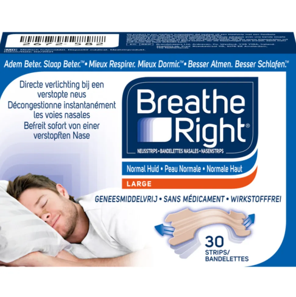 Medisch hulpmiddel Breathe Right is een transparante, wereldwijd gepatenteerde neusstrip die helpt om tijdens de slaap vrijer door de neus te ademen. Ideaal als je neus verstopt zit of als je snurkt. De neusstrips zijn gemaakt van flexibele, veerachtige banden die precies boven de neusgaten passen. Doordat de twee vleugels proberen terug te keren naar hun oorspronkelijke vorm, heffen ze de zijkanten van de neus op en openen ze de neusholtes waardoor je meer lucht door de neus binnenkrijgt.