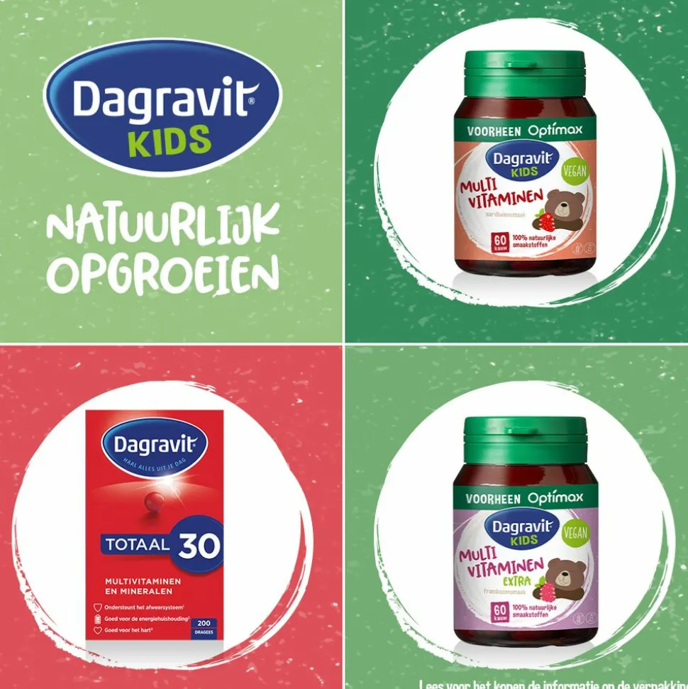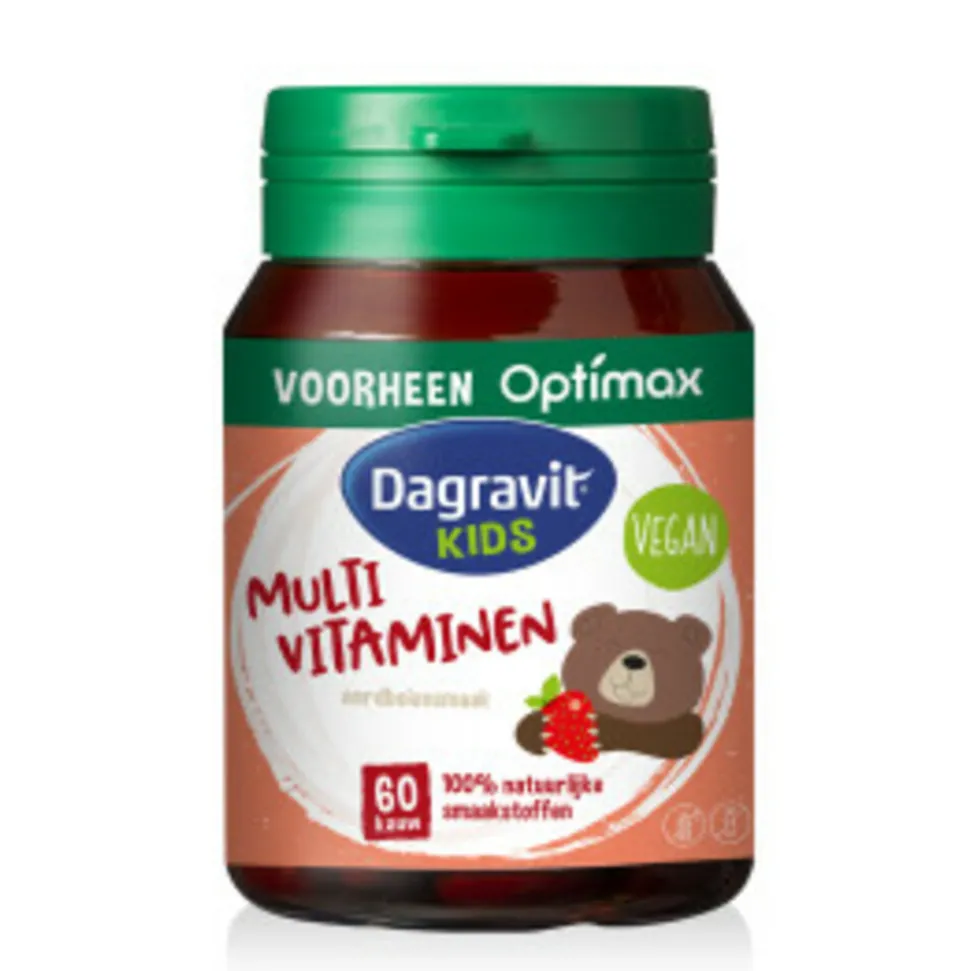 Dagravit Kids Multivitaminen is een voedingssupplement op basis van vitaminen, mineralen en planten. Deze multivitaminen is vegan en bevat 100% natuurlijke smaakstoffen. De kauwtabletten hebben een lekkere frambozensmaak.