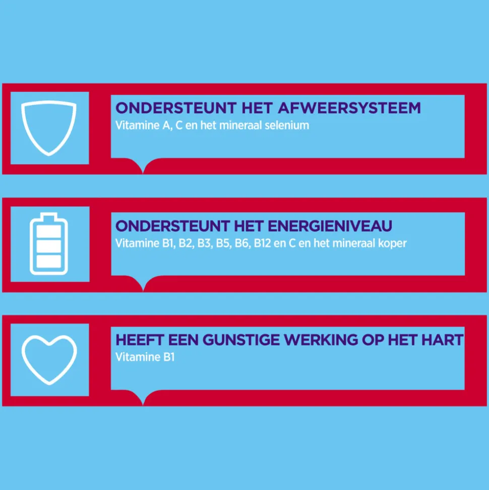 2 Vitamine B1, B2, B3, B5, B6, B12 en het mineraal koper dragen bij aan een goede energiehuishouding.