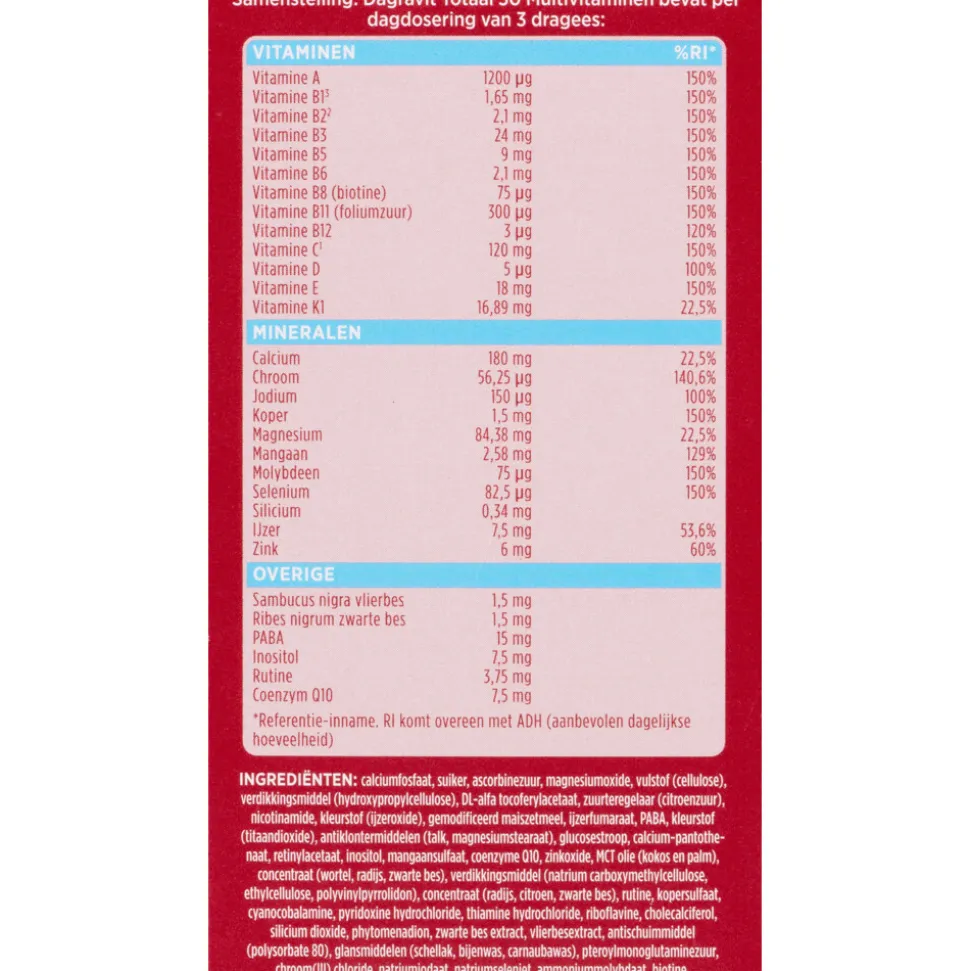 Calciumfosfaat, suiker, ascorbinezuur, magnesiumoxide, vulstof (cellulose), verdikkingsmiddel (hydroxypropyl- cellulose), DL-alfa tocoferylacetaat, zuurteregelaar (citroenzuur), nico- tinamide, kleurstof (ijzeroxide), gemodificeerd maiszetmeel, ijzerfumaraat, PABA, kleurstof (titaandioxide), antiklontermiddelen (talk, magnesium- stearaat), glucosestroop, calcium-pantothenaat, retinylacetaat, inositol, mangaansulfaat, coenzyme Q10, zinkoxide, MCT olie (kokos en palm), concentraat (wortel, radijs, zwarte bes), verdikkingsmiddel (natrium carboxy- methylcellulose, ethylcellulose, polyvinylpyrrolidon), concentraat (radijs, citroen, zwarte bes), rutine, kopersulfaat, cyanocobalamine, pyridoxine hydrochloride, thiamine hydrochloride, riboflavine, cholecalciferol, silicium dioxide, phytomenadion, zwarte bes extract, vlierbesextract, antischuimmiddel (polysorbate 80), glansmiddelen (schellak, bijenwas, carnaubawas), pteroylmonoglutaminezuur, chroom(III) chloride, natriumjodaat, natriumseleniet, ammoniummolybdaat, biotine.