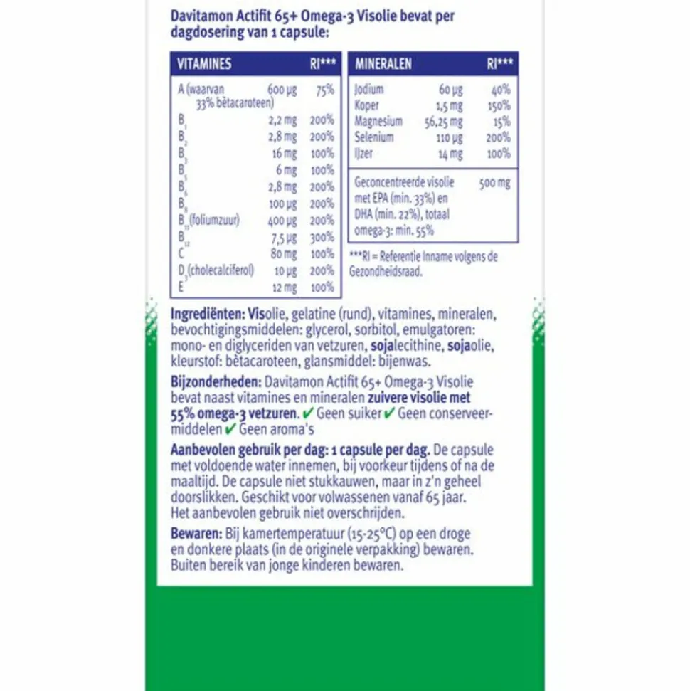 Davitamon Actifit 65+ Omega-3 Visolie is een multivitamine en mineraal waaraan visolie is toegevoegd. Davitamon Actifit 65+ met omega-3 visolie is speciaal ontwikkeld voor volwassenen vanaf 65 jaar en voorziet, als het niet lukt om alle vitaminen en mineralen door je voeding binnen te krijgen, in de dagelijkse aanvulling van vitamines en mineralen die bij het ouder worden van belang zijn.