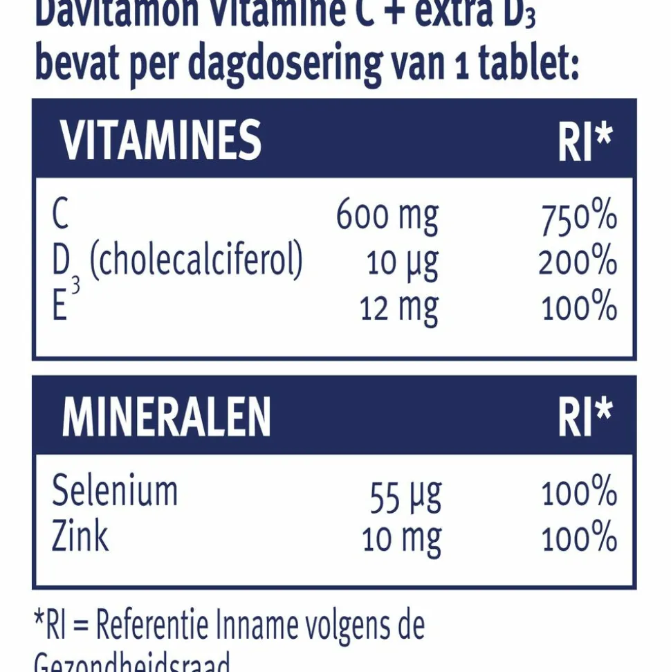 Davitamon Vitamine C Hoog Gedoseerd + Extra D3 Tabletten combineert een hoge dosering vitamine C met vitamine D, selenium en zink. De hoge dosering vitamine C heeft een positief effect op de weerstand bij lichamelijke inspanning*. Zowel vitamine C, vitamine D, selenium en zink ondersteunen de afweer en helpen het natuurlijk afweersysteem van de lichaamscellen. Het bijzondere aan dit supplement is dat de vitamines en mineralen geleidelijk vrijkomen. Wanneer je Davitamon Vitamine C + extra D3 ’s ochtends inneemt krijgt je lichaam gedurende de dag de beschikking over vitamine C, D,E, zink en selenium.