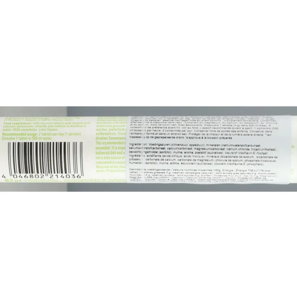 - 20 bruistabletten om in water op te lossen met magnesium, calcium, kalium, chloride en natrium.