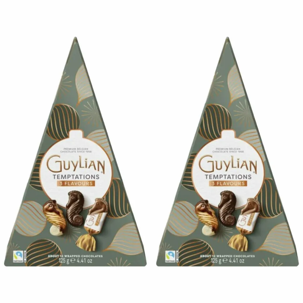 Guylian Temptations Mix Xmas Tree in een feestelijk Kerst design. Dit design bevat Guylian Temptations, individueel verpakte Zeepaardjes. De Guylian Temptations bevatten 3 verschillende smaken; Hazelnoot Praline, Karamel en Donkere Praline. Perfect om te schenken als cadeau of om zelf van te genieten.