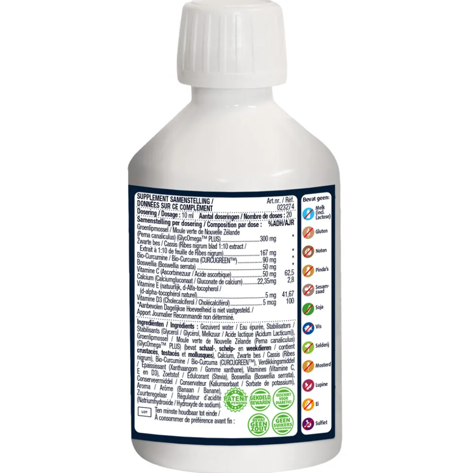 Gezuiverd water, Stabilisators (Glycerol, Melkzuur (Acidum Lacticum)), Groenlipmossel (Perna canaliculus) (GlycOmega™ PLUS) (bevat schaal-, schelp- en weekdieren), Calcium, Zwarte bes (Ribes nigrum), Bio-Curcumine (BCM-95® W8), Verdikkingsmiddel (Xanthaangom), Vitamines (Vitamine C, E en D3), Zoetstof (Stevia), Boswellia (Boswellia serrata), Conserveermiddel (Kaliumsorbaat), Aroma (Banaan), Zuurteregelaar (Natriumhydroxide). Samenstelling Hoeveelheid*** %RI*Groenlipmossel (GlycOmega™ PLUS) 300 mg **Zwarte bes (Ribes nigrum blad 1:10 extract) 167 mg **Bio-Curcumine (CURCUGREEN™) 90 mg **Boswellia (Boswellia serrata) 50 mg **Vitamine C (Ascorbinezuur) 50 mg 62,50%Calcium (Calciumgluconaat) 22,35 mg 2,8%Vitamine E (natuurlijk, d-Alfa-tocopherol) 5 mg 41,67%Vitamine D3 (Cholecalciferol) 5 mcg 100%*RI/AR = Referentie inname / Apport de référence**RI/AR = Referentie inname is niet vastgesteld. ***Op basis van een dagdosering van 10 ml.