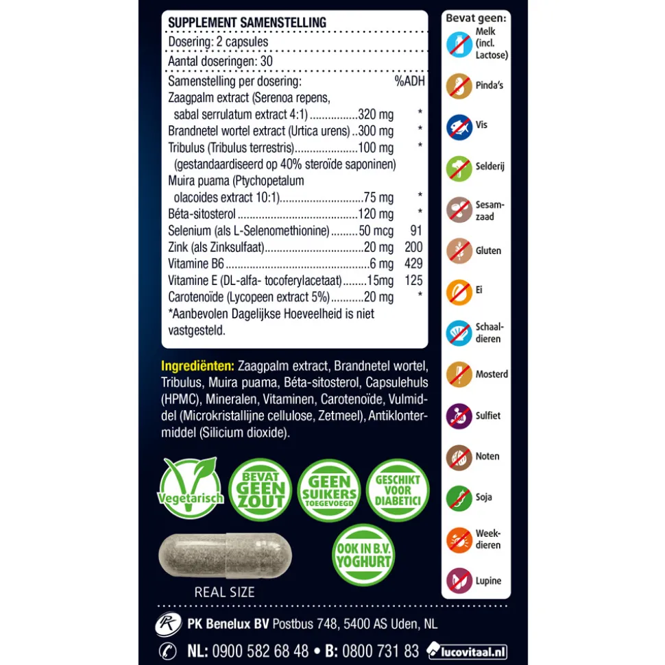 Zaagpalm extract (Serenoa repens, sabal serrulatum extract 4:1) (320 mg / *)Brandnetel wortel (Urtica urens) 300 mg / *)Tribulus (Tribulus terrestris) (100 mg / *)(gestandaardiseerd op 40% steroïde saponinen)Muira puama (Ptychopetalum olacoides extract 10:1) (75 mg / *)Béta-sitosterol (120 mg / *)Selenium (als L-Selenomethionine) (50 mcg / 91% ADH)Zink (als Zinksulfaat) (20 mg / 200% ADH)Vitamine B6 (6 mg / 429%)Vitamine E (DL-alfa-tocoferylacetaat) (15mg / 125% ADH)Carotenoïde (Lycopeen extract 5%) (20 mg / *)