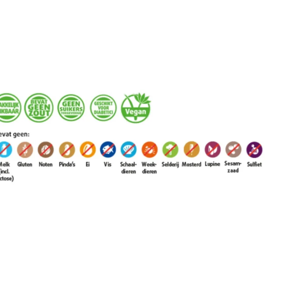 Vrij van: Melk, Gluten, Lactose, Noten, Pinda‘s, Ei, Vis, Schaaldieren, Weekdieren, Selderij, Mosterd, Lupine, Sesamzaad en Sulfiet