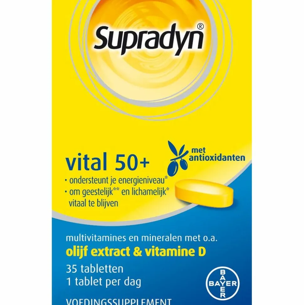 Supradyn Vital 50+ is speciaal voor de veranderende behoefte aan vitamines en mineralen bij het ouder worden. Supradyn Vital 50+ bevat een combinatie van vitamines die voorzien in de veranderende behoefte van je lichaam vanaf 50 jaar. De vitamines B1, B2, B3, B5, B6, B8, B12, C, het mineraal magnesium en het sporenelement ijzer ondersteunen je energieniveau en houden je vitaal. De mineralen ijzer, jodium en zink zijn goed voor het geheugen en behoud van een heldere geest. Essentiële vitamines en mineralen spelen een belangrijke rol bij de energiestofwisseling.