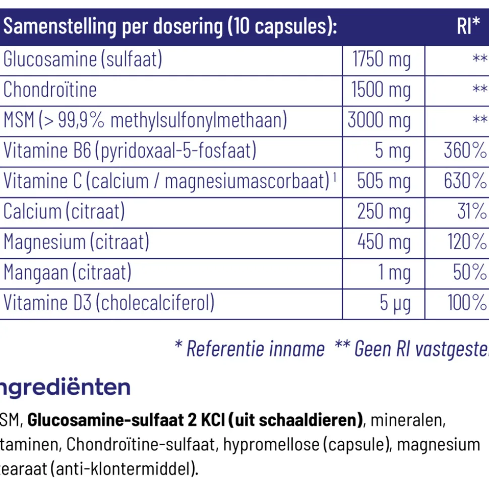 - Extreem hoge dagdoseringen van de actieve nutriënten: Glucosamine (1750 mg), Chondroïtine (1500 mg) en MSM (3000 mg)