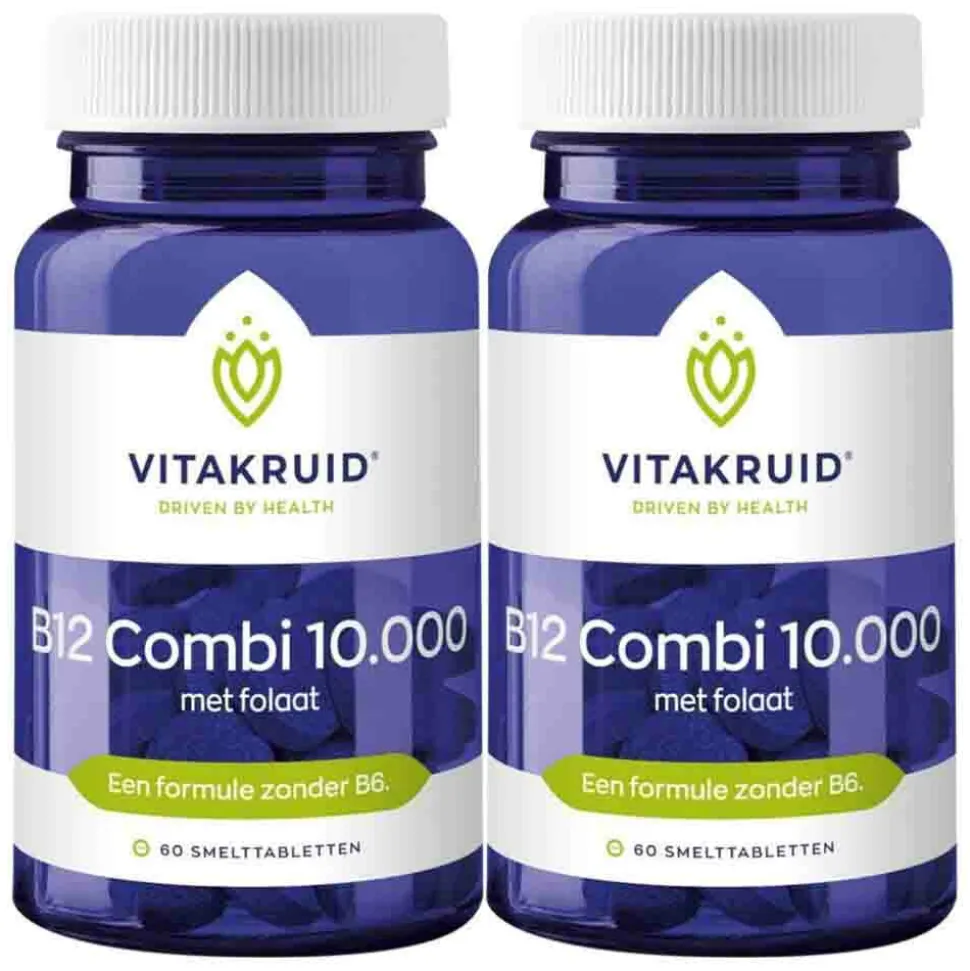 Vitakruid B12 Combi 10.000 met Folaat is een voedingssupplement met hoge doseringen B12 in de vorm van smelttabletten, die zorgen voor een snelle opname. B12 in de biologisch actieve vormen methylcobalamine en adenosylcobalamine wordt gecombineerd met de vierde generatie van folaat (Quatrefolic®). Deze vormen van vitamine B12 en folaat worden het beste door het lichaam opgenomen. Quatrefolic® (5-MTHF) heeft een uitstekende biologische beschikbaarheid in vergelijking met de synthetische vormen van foliumzuur. Het folaat is namelijk meteen functioneel voor ons lichaam en zal meteen effect hebben.Opname via het mondslijmvlies middels het lichtzoete smelttablet zorgt voor een snelle en verbeterde opname van de werkzame nutriënten.