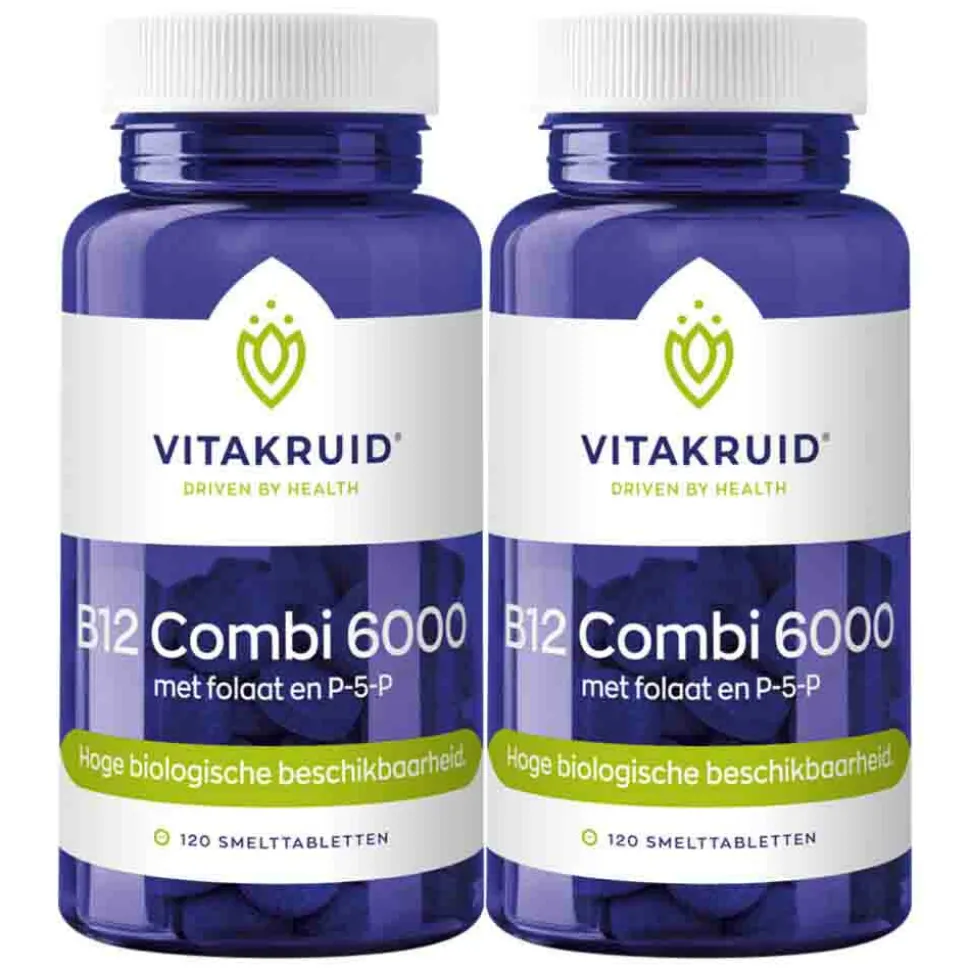 Vitakruid B12 Combi 6000mcg Smelttabletten met folaat en P-5-P is een voedingssupplement met hoog gedoseerde vitamine B12 in combinatie met folaat (foliumzuur) en P-5-P (vitamine B6). Dit vitamine B12-supplement bevat twee biologisch actieve vormen van B12, methylcobalamine en adenosylcobalamine. Dit supplement is in de vorm van een smelttablet die onder de tong kunt laten smelten. Het innemen van vitamine B12 via het mondslijmvlies zorgt namelijk voor een optimale opname van B12. Anders dan veel andere supplementen met foliumzuur, maakt Vitakruid gebruik van de meest biologisch actieve vorm van foliumzuur, namelijk 5-MTHF. Deze natuurlijk vorm wordt vele malen beter opgenomen dan niet natuurlijke foliumzuur. Daarnaast bevat dit supplement P-5-P, de actieve vorm van vitamine B6. De combinatie van vitamine B12 en folaat dragen bij aan een normale stofwisseling van eiwitten en glycogeen en aan een normale werking van het zenuwstelsel en het geheugen.