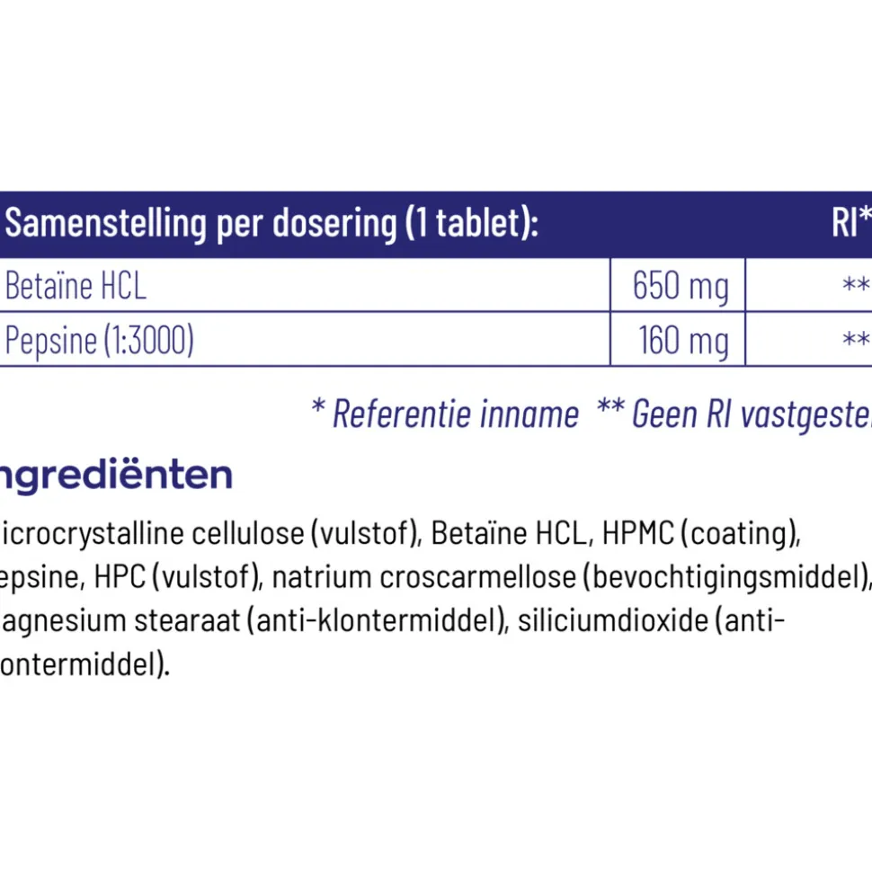 Samenstelling per standaard dagdosering van 1 tablet Betaïne HCL 650 mg Pepsine 1:3000 160 mg IngrediëntenBetaïne HCL, microcrystalline cellulose (bindmiddel), Pepsine, HPC (coating), silicium dioxide (bindmiddel), HPMC (coating), magnesium stearaat (anti-klontermiddel), glycerol (bevochtigingsmiddel).Allergenen InformatieBevat geen: gluten, gist, lactose, suiker, kunstmatige kleurstoffen, smaakstoffen of conserveermiddelen.
