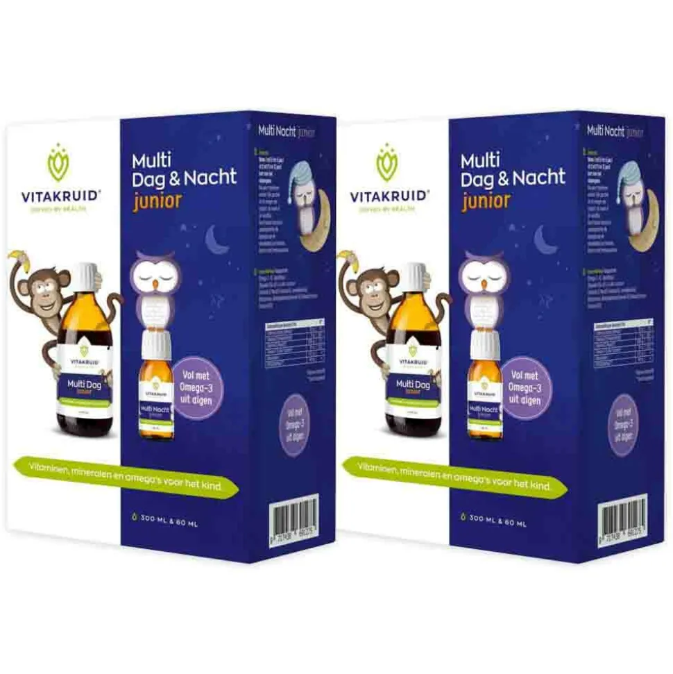 ’s Nachts wil je dat je kind ondersteund wordt in zijn psychologische en fysieke gesteldheid. Dit vereist totaal andere nutriënten dan een formule voor ondersteuning van energie, concentratie en coördinatie. Vitakruid Multi Junior Duo houdt rekening met het bioritme van je kind. En daarom bevat de Multi Nacht Junior onder andere vitamine D, voor de opbouw van sterke botten en vitamine A, voor het herstellend vermogen van de huid*
