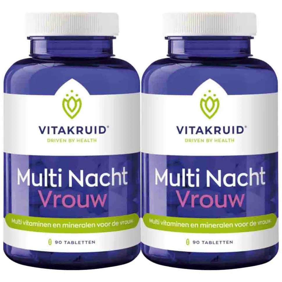 Vitakruid Multi Nacht Vrouw is een voedingssupplement op basis van vitamines en mineralen speciaal voor de vrouw. Wanneer de Vitakruid Multi Nacht Vrouw in combinatie met de Vitakruid Multi Dag Vrouw wordt gebruikt wordt ook rekening gehouden met het bioritme. Dit is de meest efficiënte en innovatieve toepassing van een Multi. ‘s Nachts heeft het lichaam meer behoefte aan de in vet oplosbare vitamines.