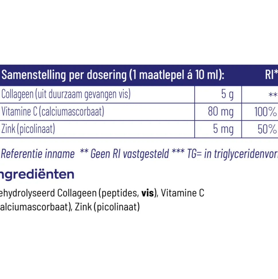 Gehydrolyseerd Collageen (peptides, vis), Vitamine C (calciumascorbaat), Zink (picolinaat).