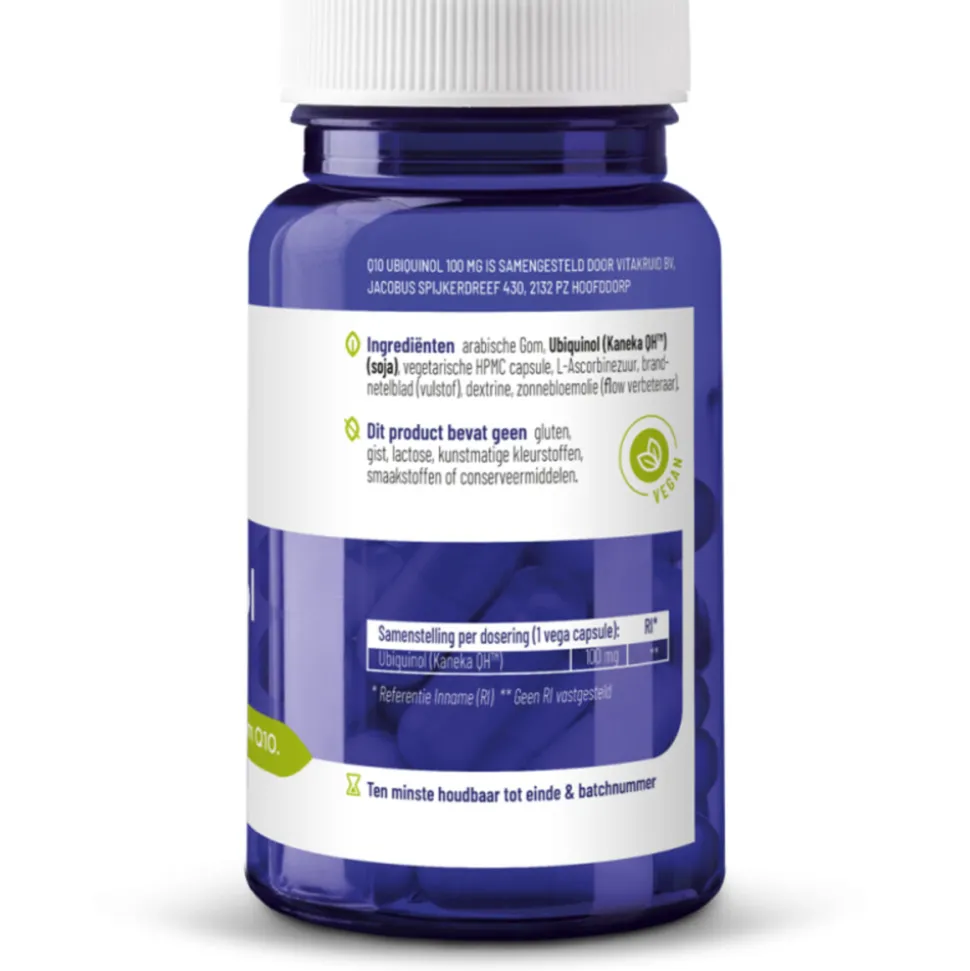 Vitakruid Q10 Ubiquinol 100mg met de biologische actieve vorm van co-enzym Q10. Ubiquinol is volledig lichaam identiek.