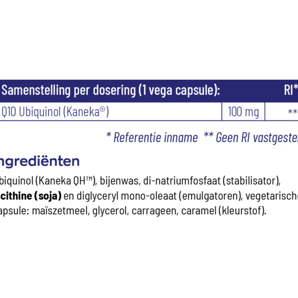 Ubiquinol (Kaneka QH™), koolzaadolie (vulstof), lecithine, bijenwas, di-natriumfosfaat (stabilisator), lecithine (uit soja) en diglyceryl mono-oleaat (emulgatoren), vegetarische capsule: maïszetmeel, glycerol, carrageen, caramel (kleurstof).