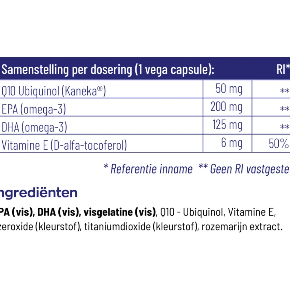 EPA (vis), DHA (vis), gelatine (Vis), Ubiquinol (Kaneka QH®), Vitamine E (D-alfa-tocoferol), rozemarijn extract (Salvia rosmarinus), natuurpigment ijzeroxide (kleurstof).