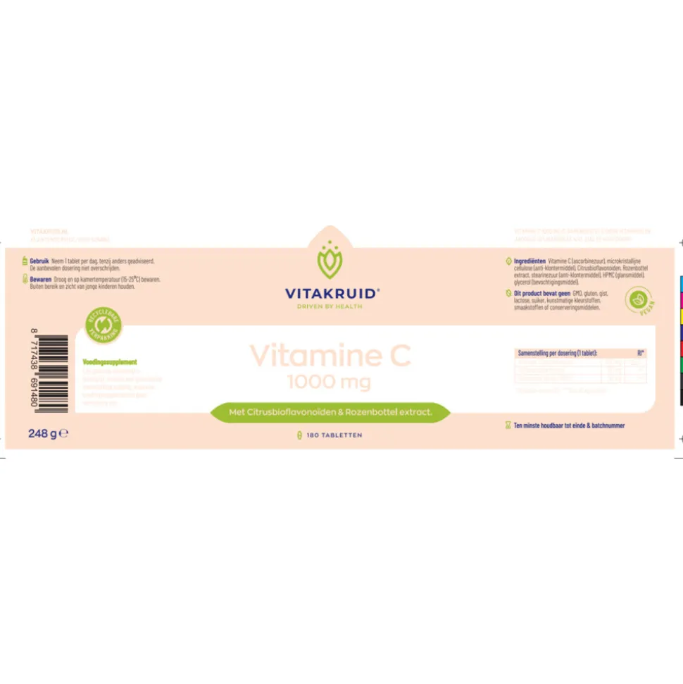 Vitakruid Vitamine C 1000 mg bevat 1000 mg Ascorbinezuur. Ascorbinezuur is de vitamine C vorm in groente en fruit. Ascorbinezuur is verreweg de bekendste vorm van vitamine C. Het is dan ook de variant die van nature in onze voeding voorkomt. Ascorbinezuur uit supplementen heeft exact dezelfde biologische beschikbaarheid en opneembaarheid als de vitamine C uit uw dagelijks gegeten stukje fruit.