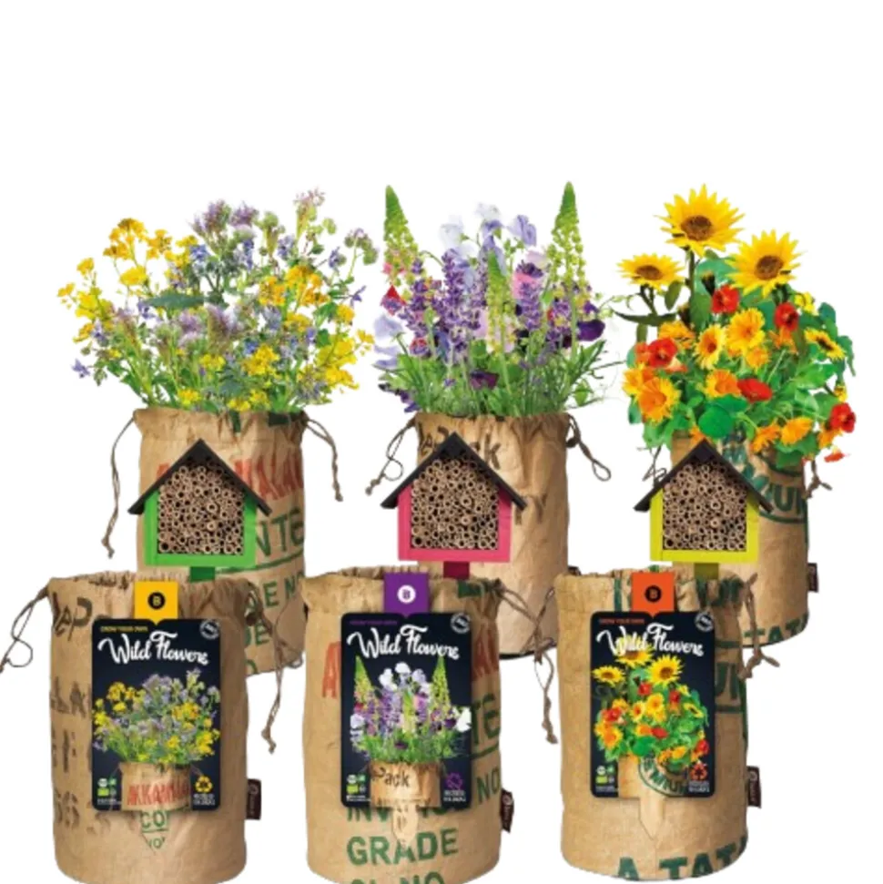 Deze kweektas met insectenhotel bevat 3 zakjes met bio zaden, die tezamen een fraai wild en kleurrijk boeket vormen op balkon en terras.