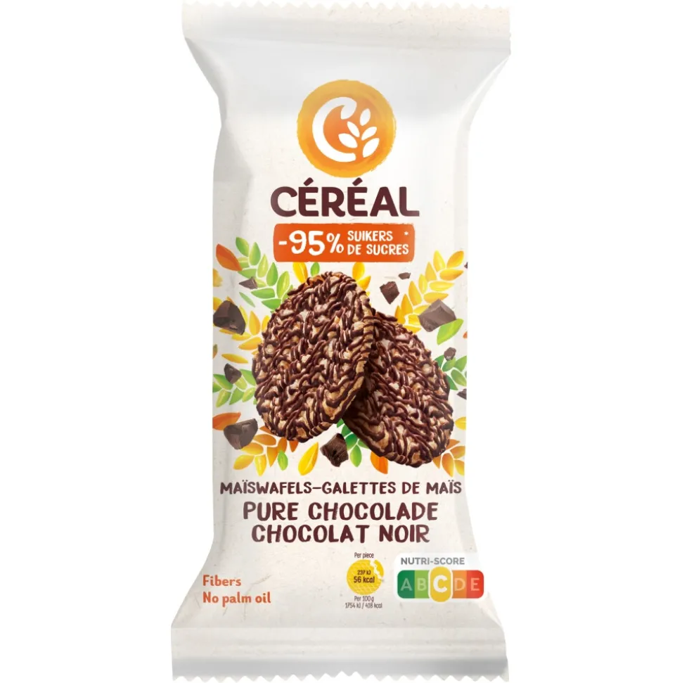 Céréal Maiswafel Puur zijn rijstwafels op basis van bruine rijst met pure chocolade, met zoetstof.