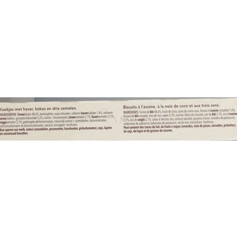 Tarwebloem 48,6%, koolzaadolie, ruwe rietsuiker, volkoren havervlokken 7,6%, volkoren tarwevlokken, geraspte kokosnoot 5,2%, inuline: chicoreivezels, tarwezemelen 2,1%, haverzemelen 2,1%, roggezemelen 2,1%, gedroogde abrikozenstukjes, natuurlijk aroma’s, rijsmiddelen: kaliumtartraten, natriumcarbonaten en kaliumcarbonaten, zeezout, emulgator: lecithinen.