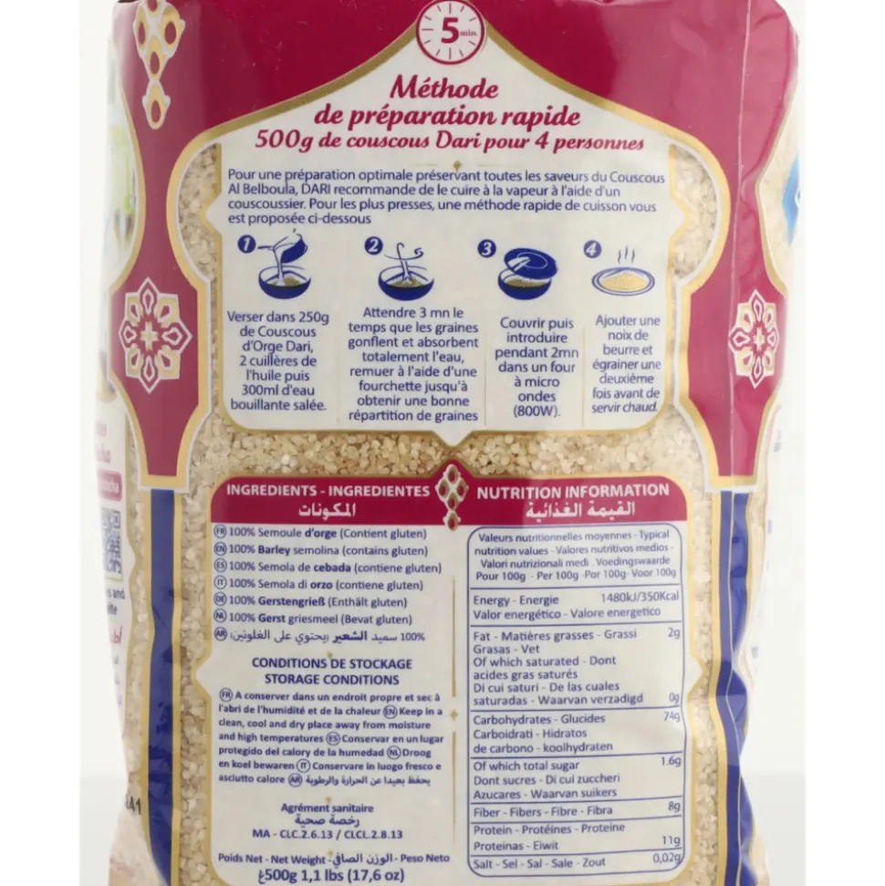 Dari Couscous Gerst Belboula is een heerlijke Marokkaanse couscous, met een wat nootachtige smaak door de gerst. Dari Couscous Gerst Belboula is een goede vervanger van rijst, pasta of aardappels.
