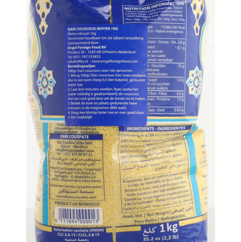 Dari Couscous Medium is een goede vervanger van rijst, pasta of aardappels. Koud geserveerd lekker als koude salade of warm als voor of hoofdgerecht met groenten, vlees, kip of vis.