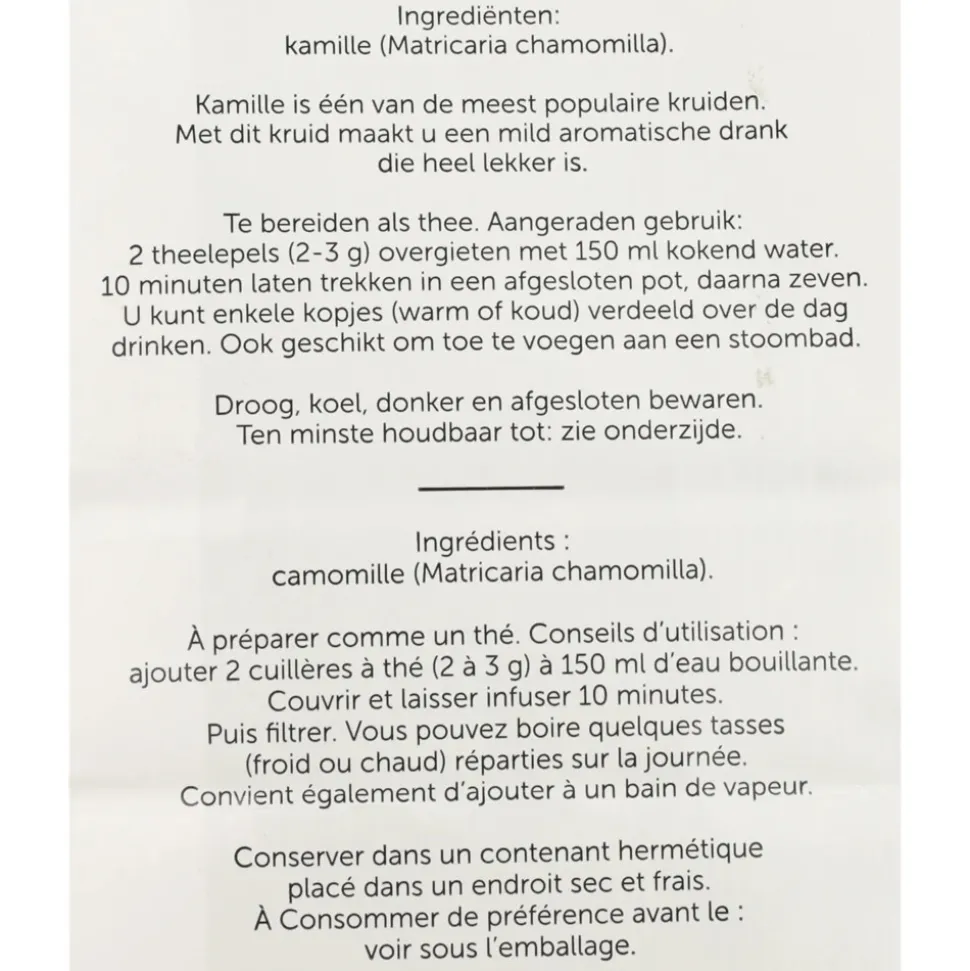 Het heilzame kruid voor vele doeleinden. Zowel in- als uitwendig. Gebruik:2 Eetlepels kruiden op een halve liter kokend water. 10 Min. laten trekken als thee. 3 x Daags een kopje warm of koud drinken. Mag gezoet worden.Droog en koel bewaren.