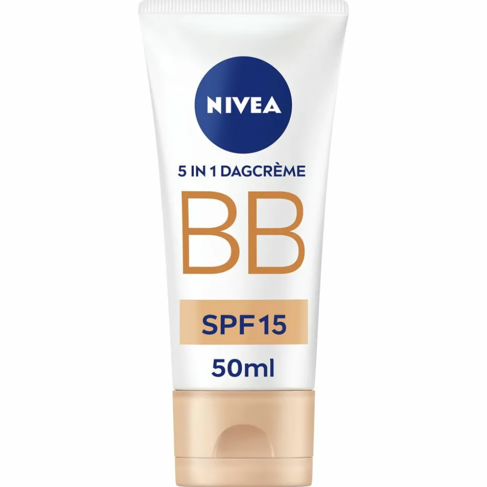 Nivea 5in1 BB Dagcrème Light SPF15 verrijkt met natuurlijke Jojoba-olie en Minerale pigMenten hydrateert de huid intensief tot 24 uur. De getinte dagcrème voor lichte huidskleur camoufleert imperfecties zoals pigMentvlekjes, tekenen van vermoeidheid, donkere kringen rond de ogen, roodheid en fijne lijntjes. De BB Dagcrème laat de huid stralen en onderstreept de natuurlijke huidteint. De SPF15 biedt bescherming tegen door zonlicht veroorzaakte invloeden.*geen ingrediënten van dierlijke oorsprong.**Instituut Cyclos-HTP certificaat voor Nederland en België.
