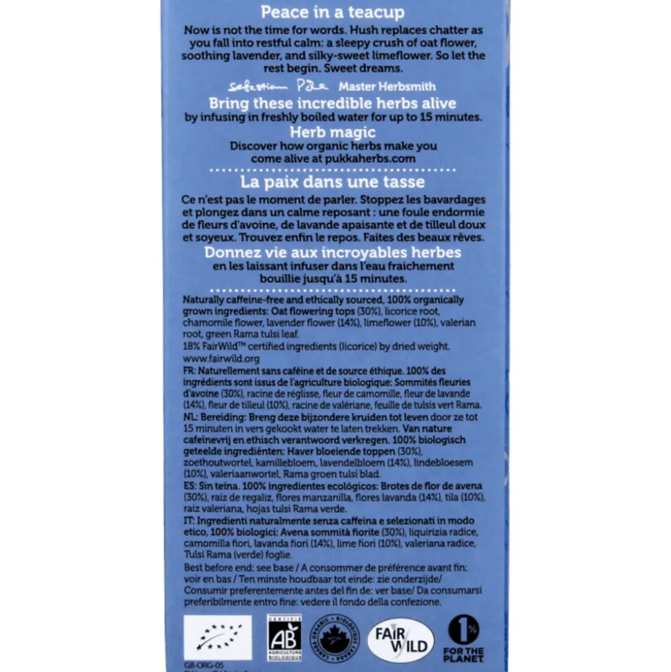 Slaapverwekkend in de goede zin. Zuiver en eerlijk. De Pukka theeën zijn gebaseerd op de helende kracht van de aloude Ayurvedische leer van evenwicht en harmonie. Alle ingrediënten zijn biologisch en ethisch verantwoord geproduceerd. Voor ieder moment en elke stemming of behoefte is er een theevariant. Kalmerend en ontspannend; een kopje Night Time brengt lichaam en geest in een staat van weldadige rust. Klaar om zich over te geven aan een ontspannen slaap en om de volgende morgen verkwikt weer op te staan. Met o.a. haverbloemtopjes, kamille, lavendel, lindebloesem en tulsiblad.
