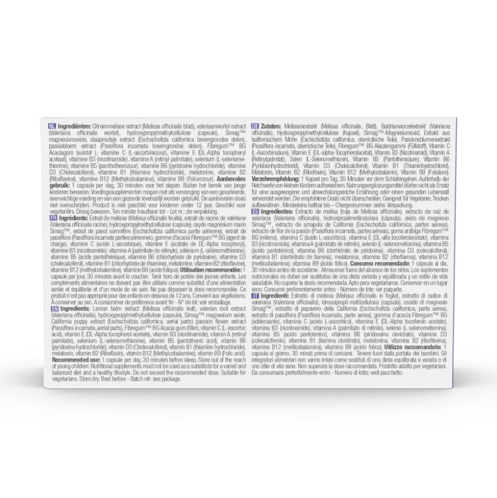 Citroenmelisse extract (Melissa officinalis blad), valeriaanwortel extract (Valeriana officinalis wortel), hydroxypropylmethylcellulose (capsule), Simag magnesiumoxide, slaapmutsje extract (Eschscholtzia californica bovengrondse delen), passiebloem extract (Passiflora incarnata bovengrondse delen), Fibregum BG Acaciagom (vulstof ), vitamine C (L-ascorbinezuur), vitamine E (DL-Alpha tocopheryl acetaat), vitamine B3 (nicotinamide), vitamine A (retinyl palmitate), selenium (L-selenomethionine), vitamine B5 (panthotheenzuur), vitamine B6 (pyridoxine hydrochloride), vitamine D3 (Cholecalciferol uit schapenwol), vitamine B1 (thiamine hydrochloride), melatonine, vitamine B2 (Riboflavine), vitamine B12 (Methylcobalamine), vitamine B9 (Foliumzuur).