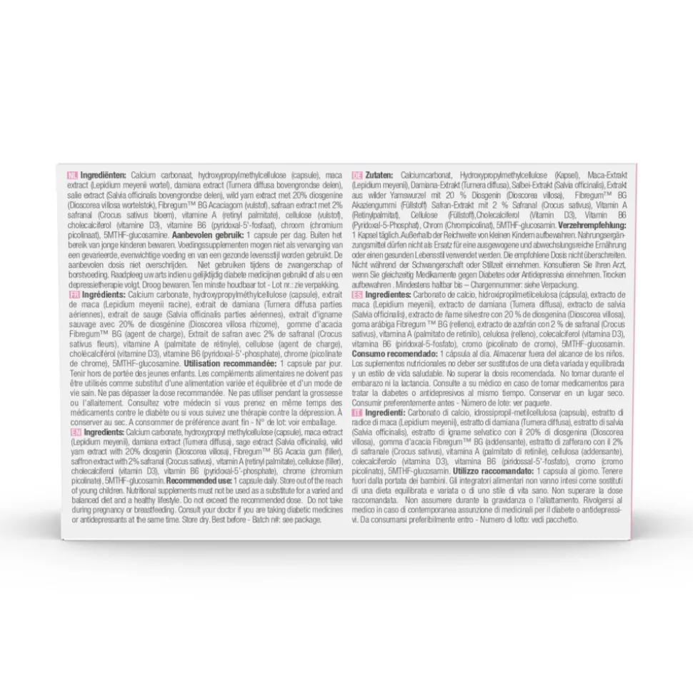 Calcium carbonaat, hydroxypropylmethylcellulose (capsule), maca extract (Lepidium meyenii wortel), damiana extract (Turnera diffusa bovengrondse delen), salie extract (Salvia officinalis bovengrondse delen), wild yam extract met 20% diosgenine (Dioscorea villosa wortelstok), Fibregum™ BG Acaciagom (vulstof), safraan extract met 2% safranal (Crocus sativus bloem), vitamine A (retinyl palmitate), cellulose (vulstof), cholecalciferol (vitamine D3 uit schapenwol) ), vitamine B6 (pyridoxal-5′-fosfaat), chroom (chromium picolinaat), 5MTHF-glucosamine.