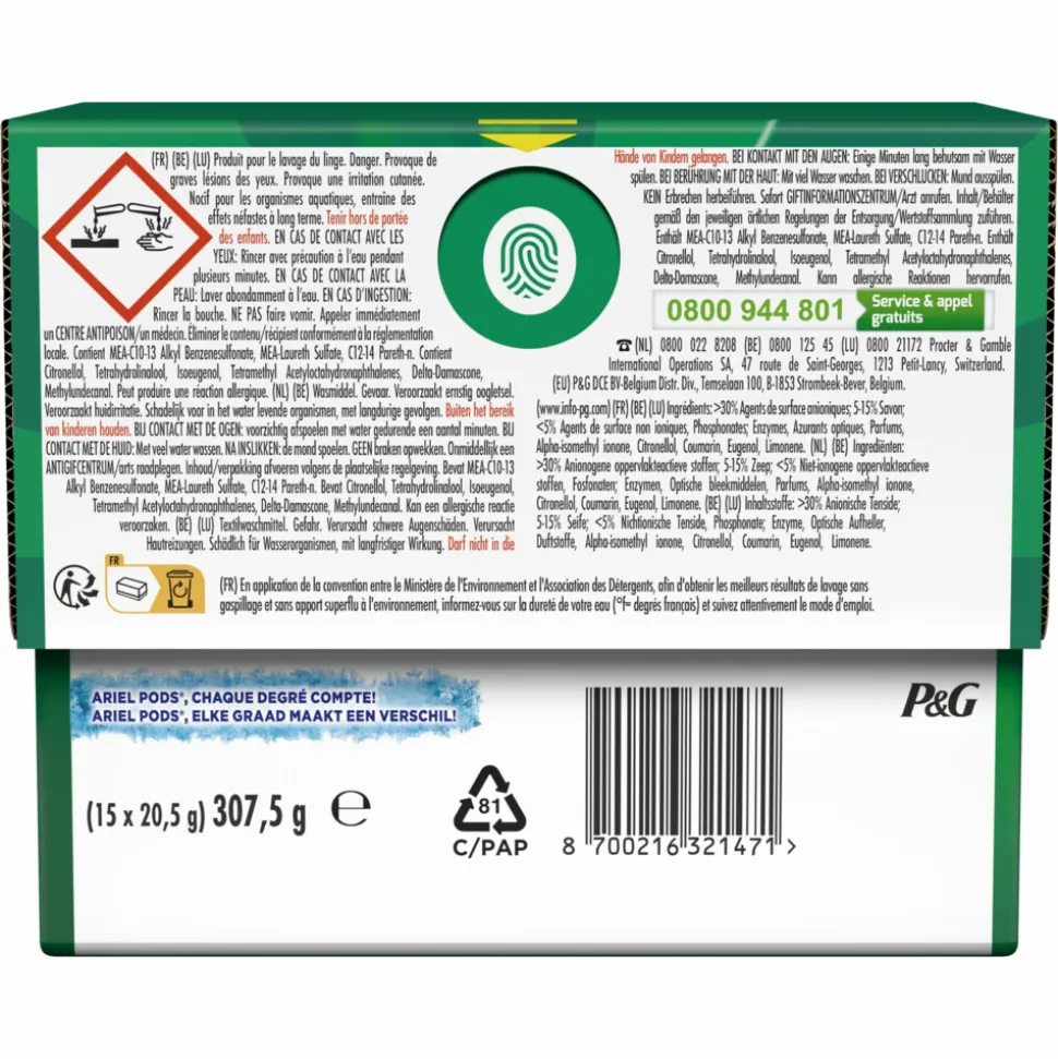 - Onberispelijk, bij koude en korte programma’s: Ariel 3in1 PODS bieden onberispelijke resultaten bij koude en korte programma’s