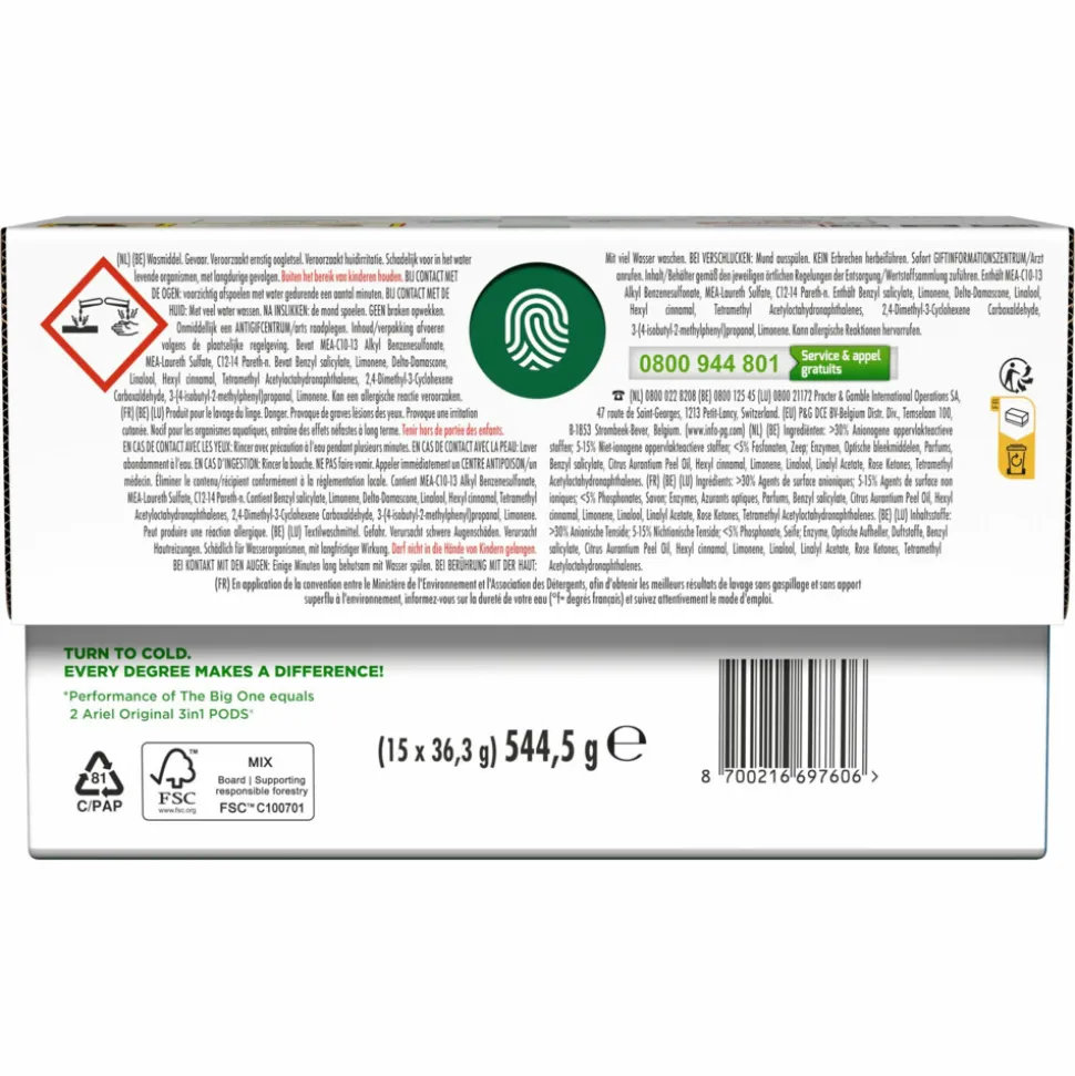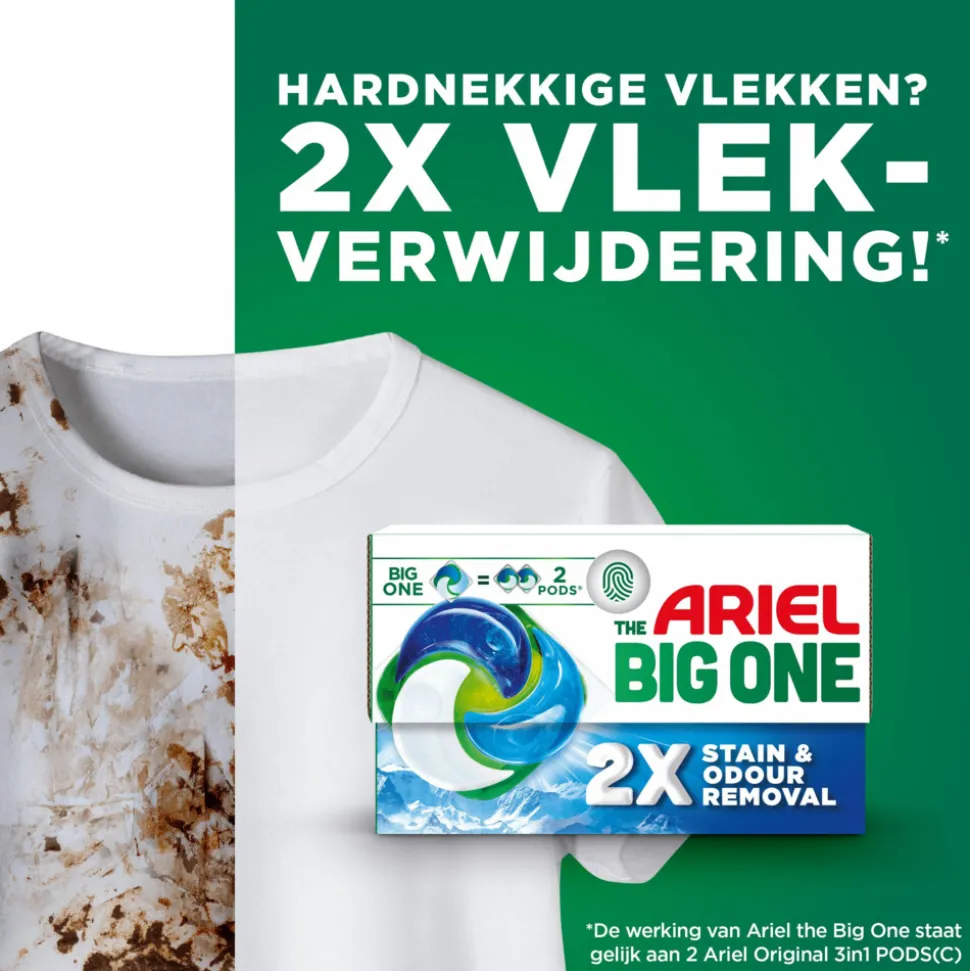 - Ariel The Big One wascapsules Alpine Freshness. Door de geïntegreerde voorbehandeling hoeft opnieuw wassen niet, ook niet bij zwaar bevuilde was