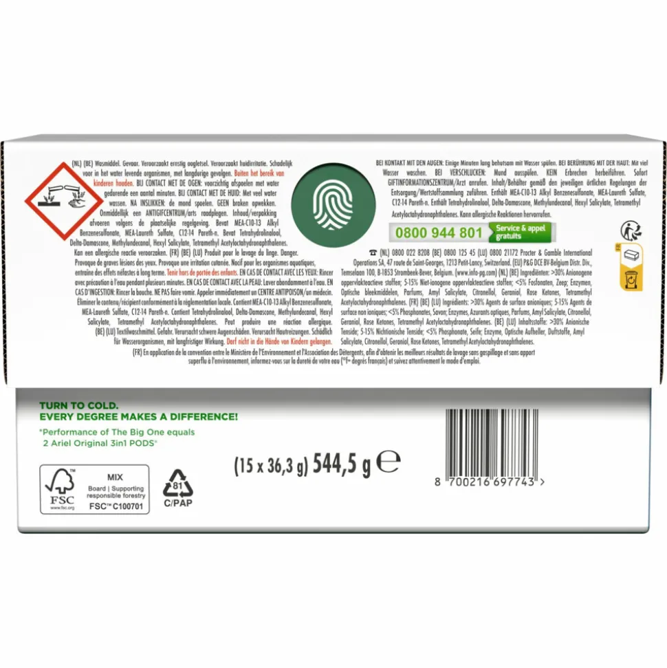 Ontdek Ariel The Big One Pods wasmiddelcapsules Original, met 2X zoveel vlek- & geurverwijdering (de werking van Ariel the Big One staat gelijk aan 2 Ariel Original 3in1 Pods). U krijgt de maximale reiniging van Ariel voor minimale inspanning: met de geïntegreerde voorbehandeling hoeft u nooit opnieuw te wassen, zelfs de zwaar bevuilde was. Bovendien zijn de pods zo ontworpen dat ze briljant werken, zelfs op lagere temperaturen: ze lossen snel op, zelfs in koud water, en leveren een onberispelijke resultaat. Was kouder en bespaar tot 60% op de elektriciteitskosten van uw wasmachine (energieverbruik wasmachine van 60 tot 30 °C, normale cyclus). Leg voor het beste resultaat eerst de pod achterin de trommel en dan de kleding er bovenop. Houd Ariel The Big One Pods altijd buiten het bereik van kinderen. Ga naar keepcapsfromkids.eu voor meer informatie.