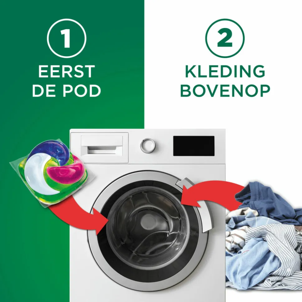 - Eerst de pod in de trommel, dan de kleding er bovenop om hardnekkige vlekken te verwijderen, zelfs in koud water