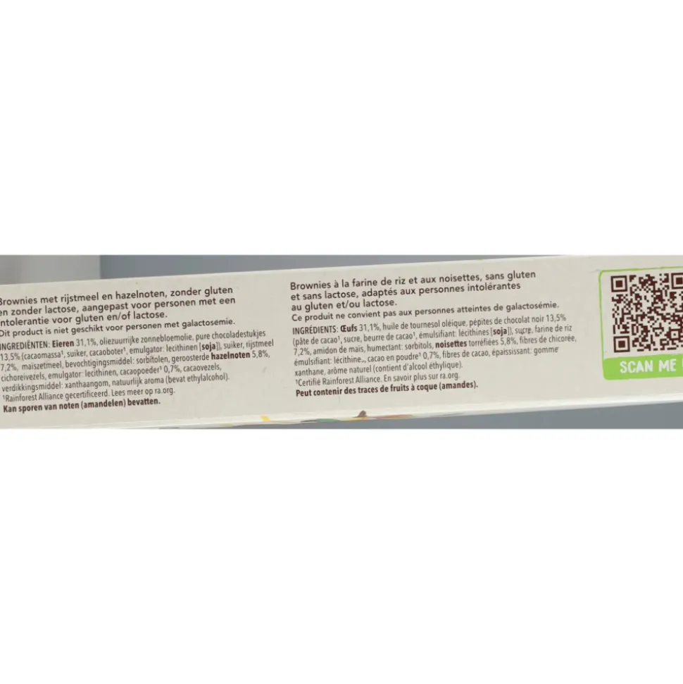 Eieren, zonnebloemolie, suiker, pure chocoladestukjes 15% (cacaomassa, suiker, cacaoboter, emulgator: sojalecithinen, natuurlijk vanillearoma),geroosterde hazelnoten 5,1%,rijstbloem,maïszetmeel,bevochtigingsmiddel:,sorbitolen,cacaopoeder,emulgator: lecithinen, aroma (bevat ethylalcohol),bewaarmiddel: calciumpropionaat, verdikkingsmiddel: xanthaangom