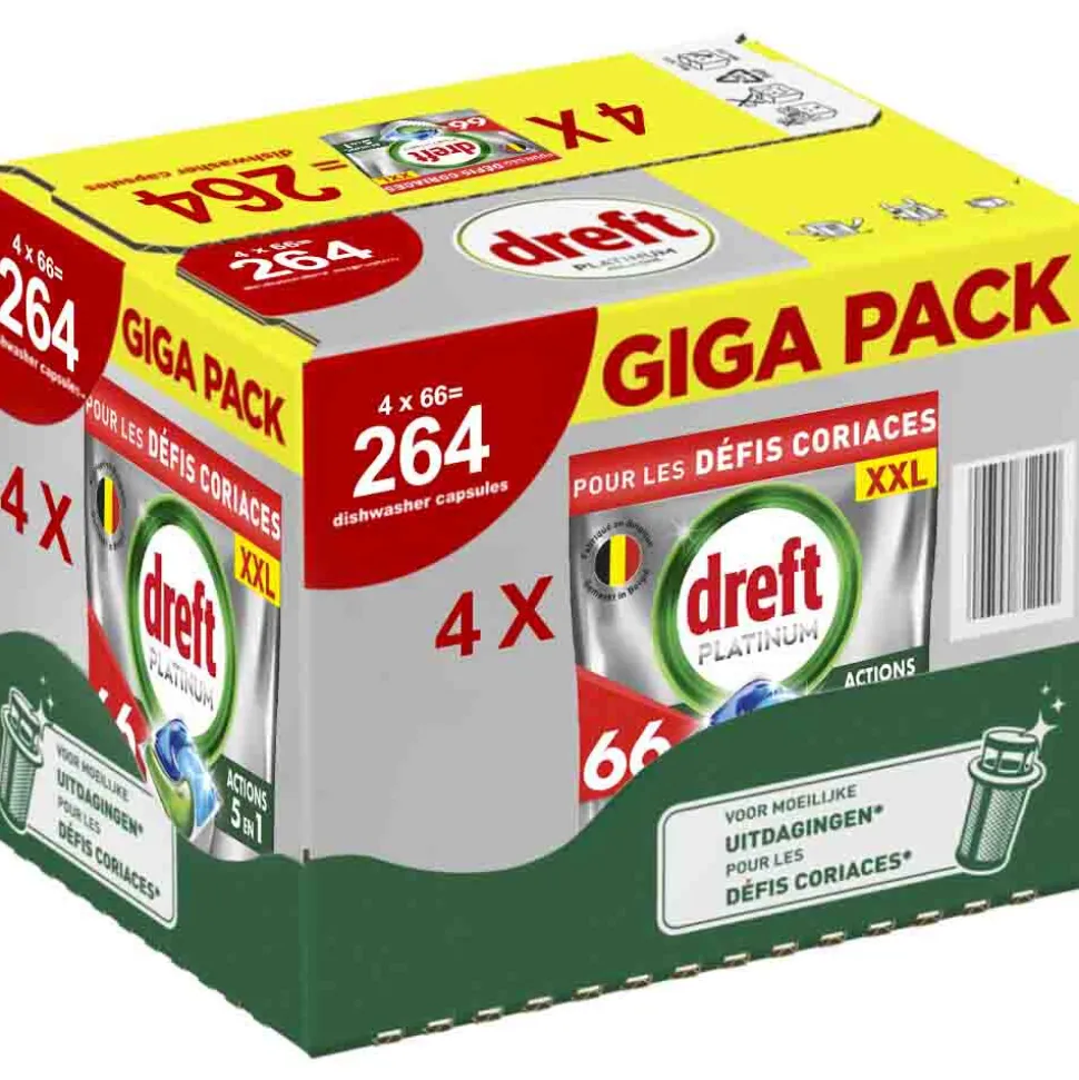 De Dreft Platinum All in One vaatwastabletten leveren een grondige reinigingsactie en reinigen zelfs de hardnekkigste vlekken om je vaat te laten schitteren. Dankzij de reinigingskracht van Dreft Platinum kun je in alle vertrouwen koken wat je wilt, want het haalt zelfs het vet uit je filter, voor een schone vaat en een frisse vaatwasser. Dreft combineert vloeistof en poeder in één krachtige capsule. Het ultra-oplosbare zakje lost snel op, zodat het snel begint te reinigen om de klus klaar te krijgen. En ze zijn gemakkelijk te gebruiken. Plaats ze gewoon in het doseerbakje van je vaatwasser, met verpakking.