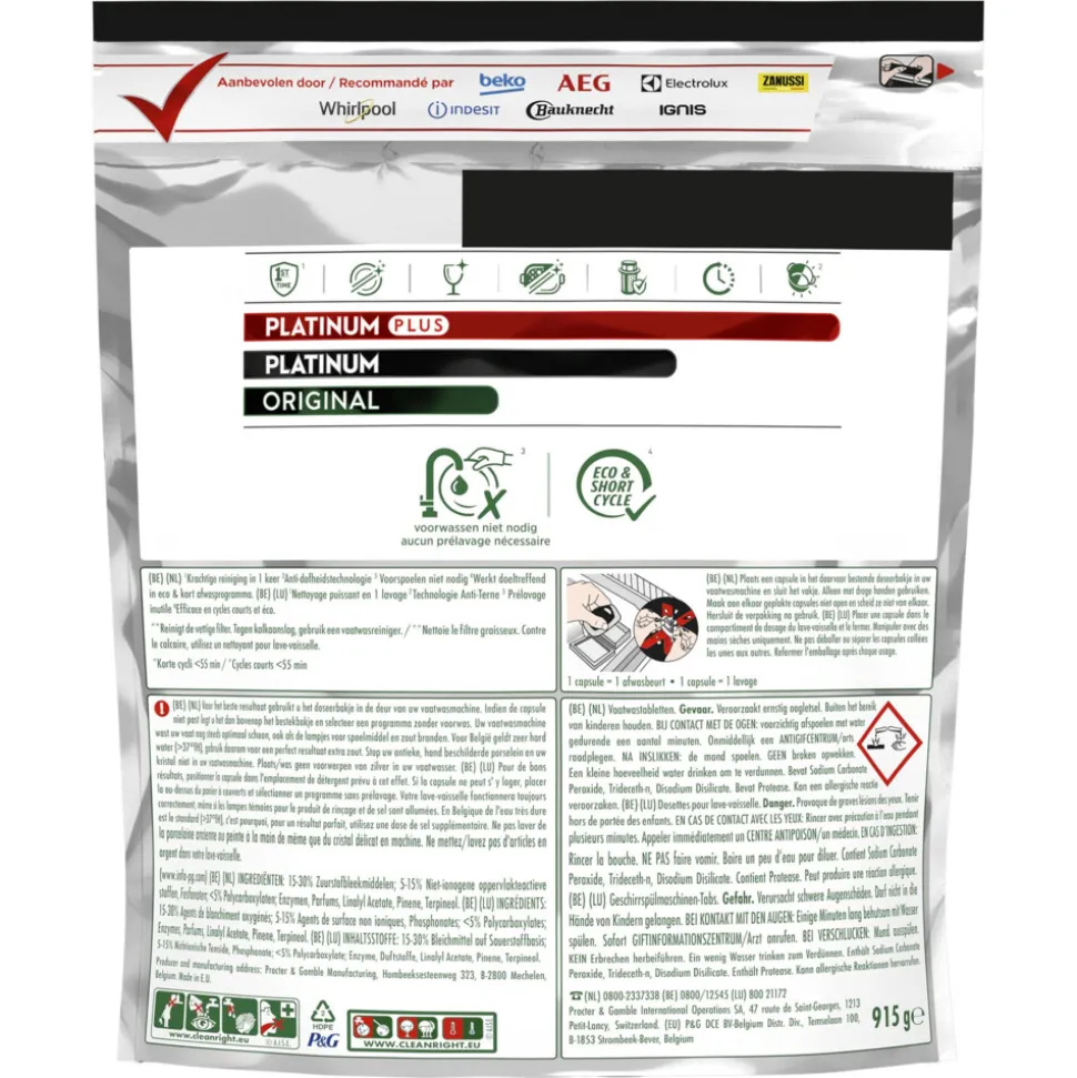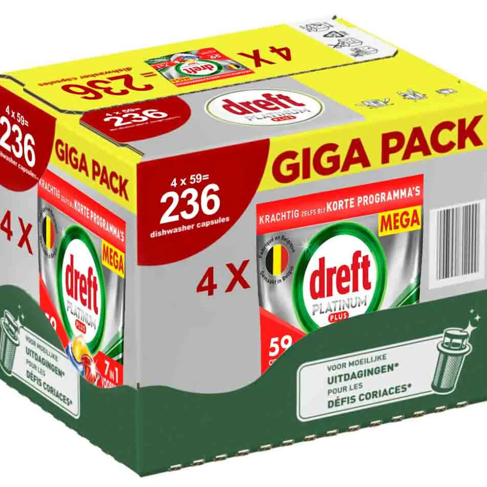 Dreft Platinum Plus All in One vaatwastabletten zorgen voor een reiniging als nieuw, het geeft je Dreft’s beste collectie voor het reinigen van hardnekkig voedsel en het helpt zelfs de dofheid weg te nemen die in de loop van de tijd is opgebouwd, om de oorspronkelijke glans van je vaatwerk te herstellen. Dreft Platinum Plus geeft je een uitmuntende reiniging en verwijdert hardnekkige voedselvlekken, zelfs in de testconditie van een korte cyclus. Dus, als je weinig tijd hebt, is er niets aan de hand. Schakel over op kort. Dreft combineert vloeistof en poeder in één krachtige capsule. Het ultra-oplosbare zakje lost snel op en werkt goed in korte cycli omdat het snel begint te reinigen om de klus klaar te krijgen. En ze zijn gemakkelijk te gebruiken. Plaats ze gewoon in het doseerbakje van je vaatwasser, met verpakking.