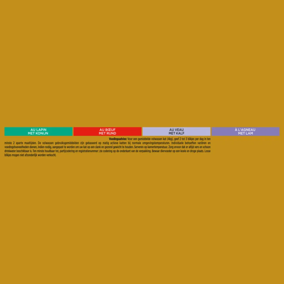 Vlees en dierlijke bijproducten (58% waarvan konijn 4%), mineralen, plantaardige bijproducten, suiker. Vlees en dierlijke bijproducten (57% waarvan rund 4%), mineralen, plantaardige bijproducten, suiker. Vlees en dierlijke bijproducten (58% waarvan kalfsvlees 4%), mineralen, plantaardige bijproducten, suiker. Vlees en dierlijke bijproducten (56% waarvan lam 4%), mineralen, plantaardige bijproducten, suiker.